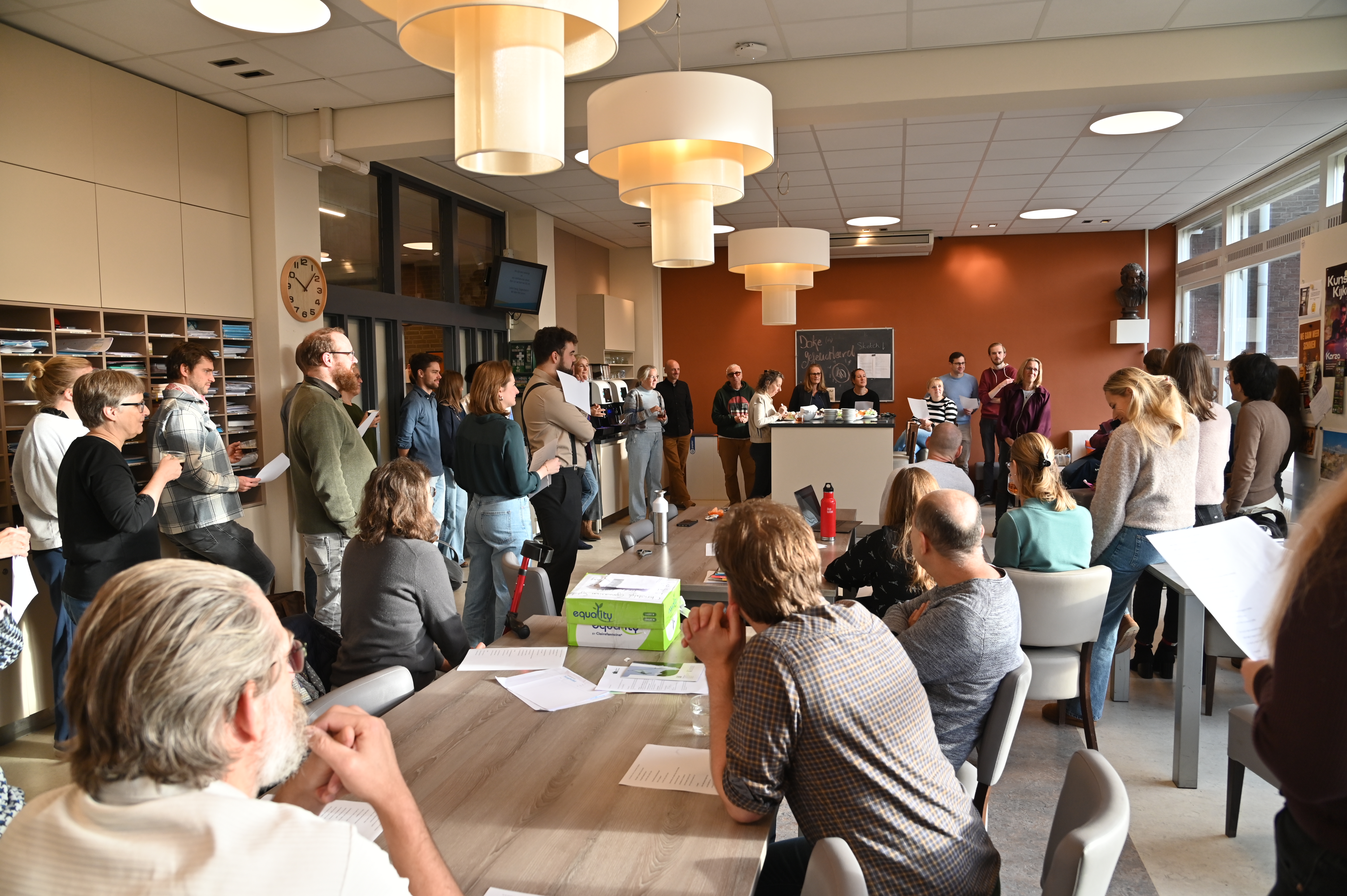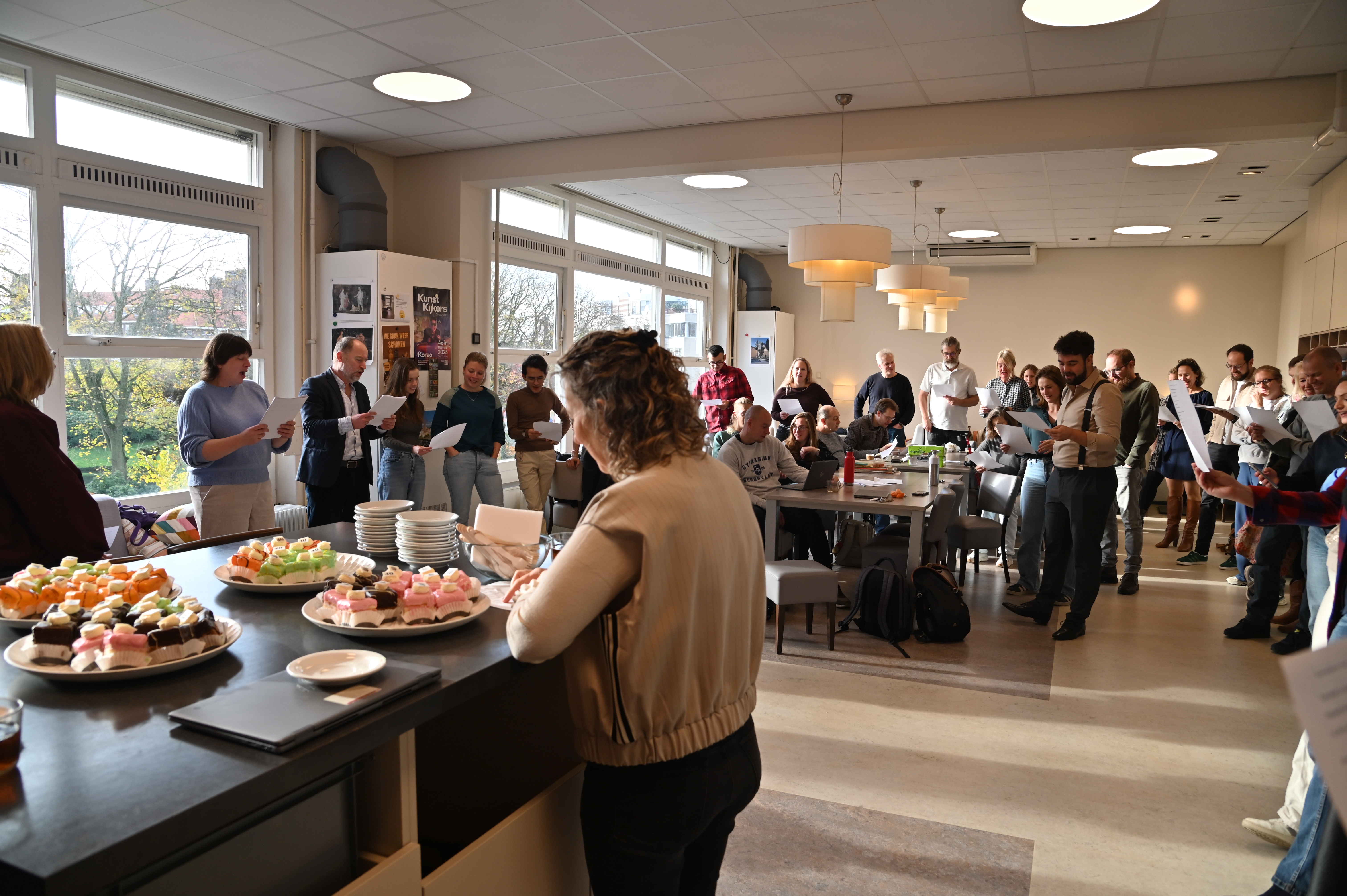 Vandaag hebben we gevierd dat Joke Hagoort veertig jaar op Sorghvliet werkt. In die jaren heeft ze vele rollen vervuld. De voornaamste vervult ze nog steeds met veel élan: docent Nederlands en conrector. Er was dus alle reden voor taart; en alle reden om haar met z'n allen toe te zingen. Dat hebben we gedaan. Lang leve Joke Hagoort.