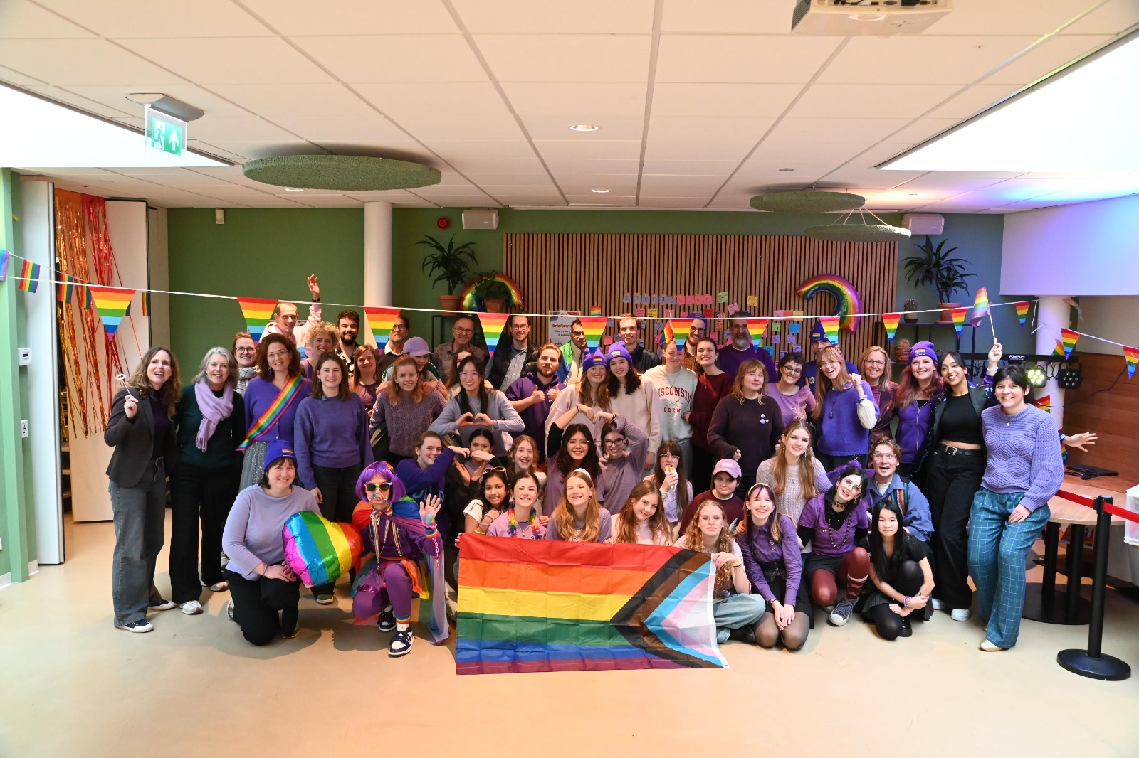 De GSA (Gender and Sexuality Alliance) had weer een mooie dag voorbereid en pakte flink uit in de Baula, die voor een dag werd omgetoverd tot een kleurrijke en vrolijke activiteitenmarkt voor leerlingen en docenten. Een markt met suikerspinnen, een regenboogdisco en een wall of love & support. Als hoogtepunt was er natuurlijk de foto met iedereen in het paars. GSA, dankjulliewel voor een spetterende dag!