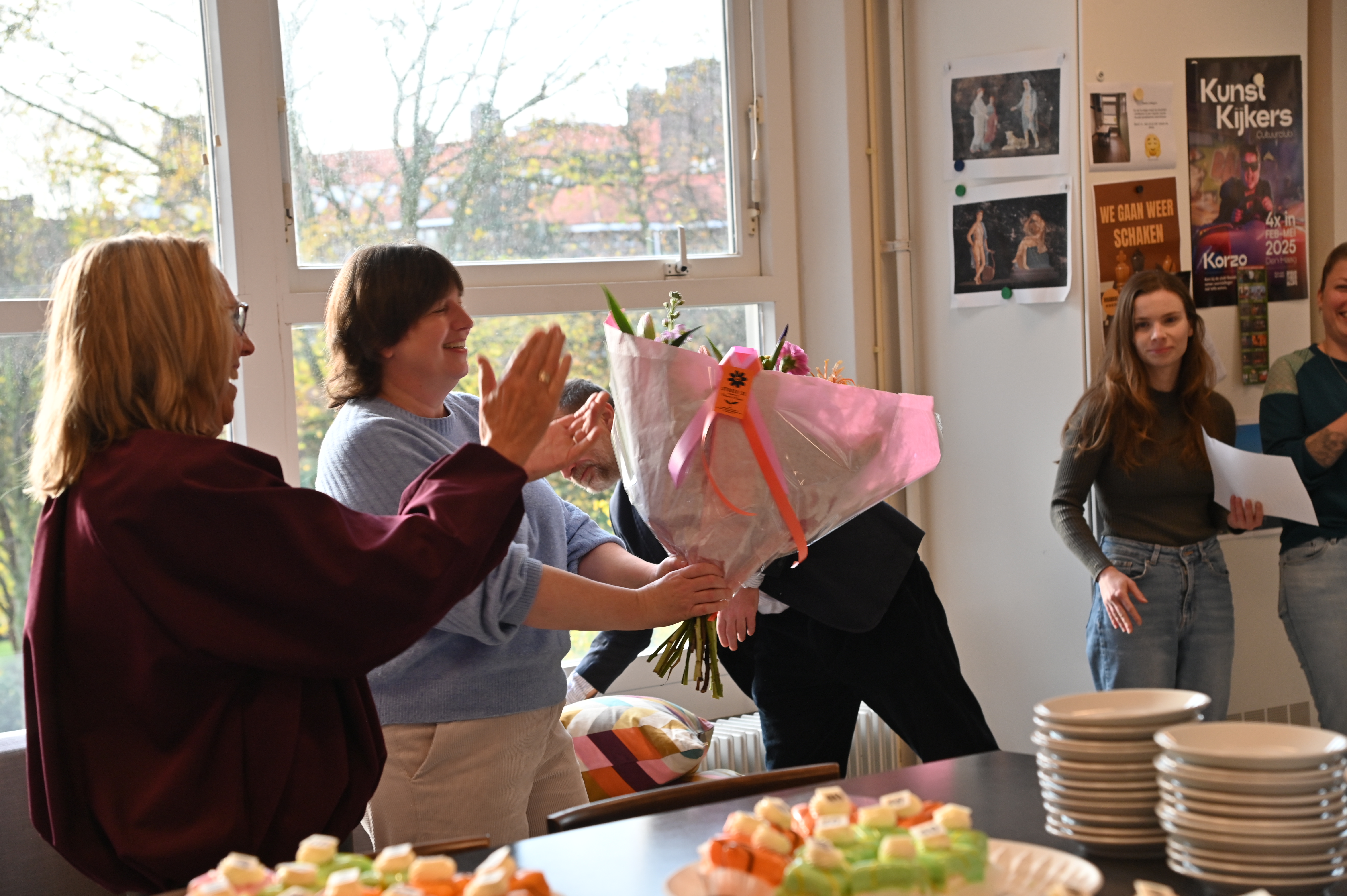 Vandaag hebben we gevierd dat Joke Hagoort veertig jaar op Sorghvliet werkt. In die jaren heeft ze vele rollen vervuld. De voornaamste vervult ze nog steeds met veel élan: docent Nederlands en conrector. Er was dus alle reden voor taart; en alle reden om haar met z'n allen toe te zingen. Dat hebben we gedaan. Lang leve Joke Hagoort.